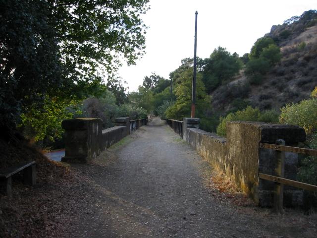 The main bridge at the junction of the two roads into the park (both have never been open at the same time while I've been here). I think this was an old train trestle, probably the only one still standing. It's just a pedestrian and bike overpass now, but it does give some of the flavor of the great old construction. Shot November 16, 2003. |