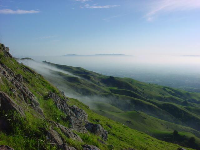 Mission Peak is a fairly stiff climb of about 2000 feet elevation without much flat trail involved. It's also probably the most spectacular of east bay spots, partly because of the variable weather. It was fairly temperate on the way up, though we were in the fog most of the hike. But it was incredibly windy and cold. We spent quite a bit of time in the lee of some rocks. But the views were far more spectacular than even our best shots indicate. January 25, 2003. |