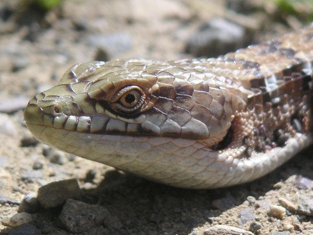A fairly large and brightly colored alligator lizard, but not enormously special. I had to stick it here primarily because of the detail around the nostril. The scales and eyelid are pretty sharp, too, but the light is not best.