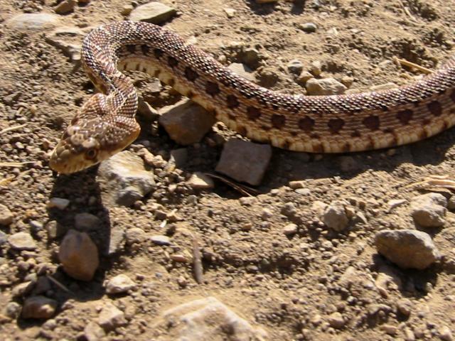 Happened across this charmer at Alum Rock Park October 30, 2003 while riding my bike up the Eagle Rock trail. It looked to be sleeping in the road, so I went a bit past it, put down the bike and got out the camera. But when I approached, it had a little bit of a fit and started to head off the trail fairly fast. Not an easy shot. Note the flattened skin behind the head, like a cobra. |