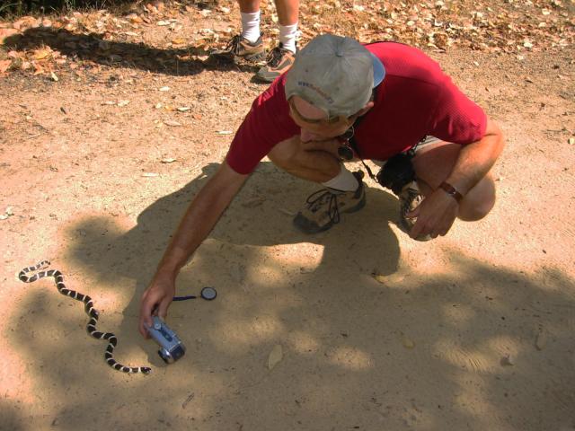 That's how it's done. Oh, okay. You have to sing a little Lizard or Snake tune sometimes, or have someone hypnotic like Akkana or Jane to stand behind you and distract the Savage Beasts. Otherwise there's nothing to it. On the other hand, now you know why there are no closeups of the young rattlesnake I nearly tripped over the weekend before this. Akk shot this while I was pulled back a little; the shot you just saw was from maybe 1-1/2 inches closer. I got perhaps twenty shots, most of them good. One with the tongue flicking out... |