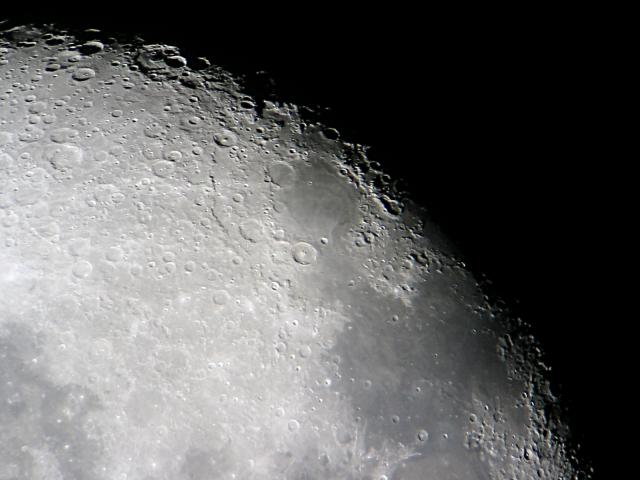 Things were looking good, so out came the 7mm eyepiece. It's a bit tricky to hold the camera in place, but for some reason I wasn't having much trouble that evening. Maybe practice really does help. The Altai Scarp doesn't show quite as well as it often does when the light is from the other side, but we have pretty good detail on Theophilus, Cyrillus and Catherina. Not to mention Janssen in the top left. I think that's the first time I've managed to get even a hint of a rille to show up. |