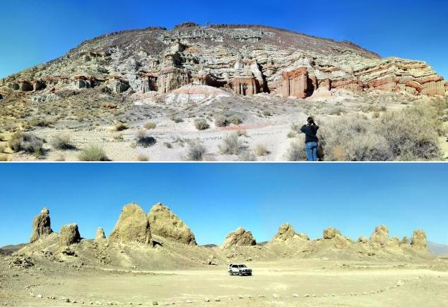 Another Trona shot at bottom. At the top is the entrance to Red Rocks Park on the way back from Death Valley. We've driven by it a bunch of times and decided to finally stop and look. The park looks like RV Heaven and of no interest at all, but the road in is neat. Obviously I was hypnotized by the potential of panoramas at this time, if not able to develop the full kinetic. Should you wish to see yet more they might be of interest. |