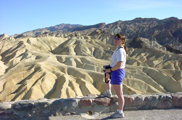One lame trick is to stick a pretty girl in the picture. Makes it more fun, but still doesn't quite capture The Point. Note the little stone boundary around the observing area. No, it's not a 'fall-off' edge, just a warning of sorts. (A Universal Symbol to the hundred or so other tourists gawking in twenty different languages). You can step right over it and get to more hazardous outlooks. So of course we did. |