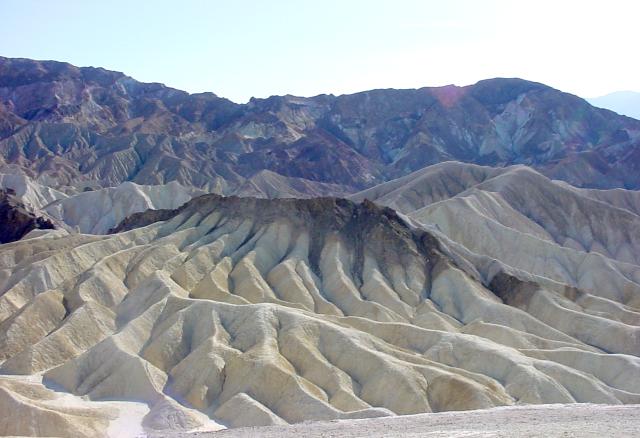 Risking life and limb to get a shot of the wash (best seen at bottom left) that's doing the active Zabrisking. The colors are from oxidized iron and magnesium (and other metals) in volcanic dust that settled to form these strata, which weather very easily. Stick around a few hundred thousand years and this just won't be the same any more. I look forward to seeing the changes. |