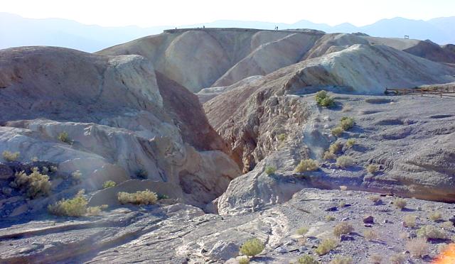 Where the creek turns away from the road to start cutting Zabriskie Gulch (or whatever they call it). At the top, the observation area complete with ant people. Crowd is getting thin this near sunset. To the right is the parking area fence, so you can see what a devilish hike it is to see The Point. It turns out that 'Zabriskie' is also a euphemism for chabobs. |
