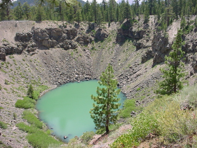 A crater not too far from the fault. None of these volcanic features are very old, and there is still earthquake activity and outgassing. Nobody really has any idea when Mammoth will blow again, and at least one previous explosive eruption in this area was massive enough to obliterate everything in the area. |