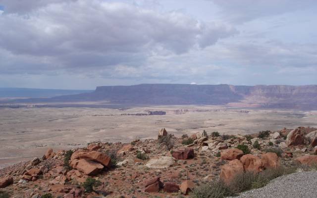 Escaping Lake Havasu City, we hotfooted to Flagstaff for a thoroughly pleasant evening at the Days Inn (yet again). Dinner was at a local Mex spot just up Milton Road; they had reasonable sopaipillas and the food was quite good. A franchise-free day. The next day we made the short and scenic run up to Page, which drifts past the tail of the Painted Desert. There are some nice Chinle formations right along the road. Ak scored a replacement wedding ring at the Chief Yellowhorse Roadside Emporium, a favorite spot. They had a wonderful T-shirt with the caption "Homeland Security: Fighting Terrorism Since 1492" with a picture of Geronimo and some of his buds. I was only prevented from getting it by the fact that this was Navajo country and he was Apache. Related, but not the same. As you climb the plateau to Page, a roadside stop gives a great view of Marble Canyon (above), the far upper end of the Grand Canyon, in a sense. The little white dot below the low cliff on the right is probably Cliff Dwellers, a delightful little roadside restaurant near some truly weird stone dwellings. |