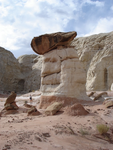 This may be the coolest hoodoo anywhere. The brooding face, combined with the floppy plush cap, reminds me very much of a famous painting of Sir Thomas More, author of Utopia and beheaded by Henry VIII. For those who prefer less grim tales, I think Rembrandt also had a similar hat. He didn't look much like that, though. Note the miniature Akkana to the left. This is a big hoodoo. |
