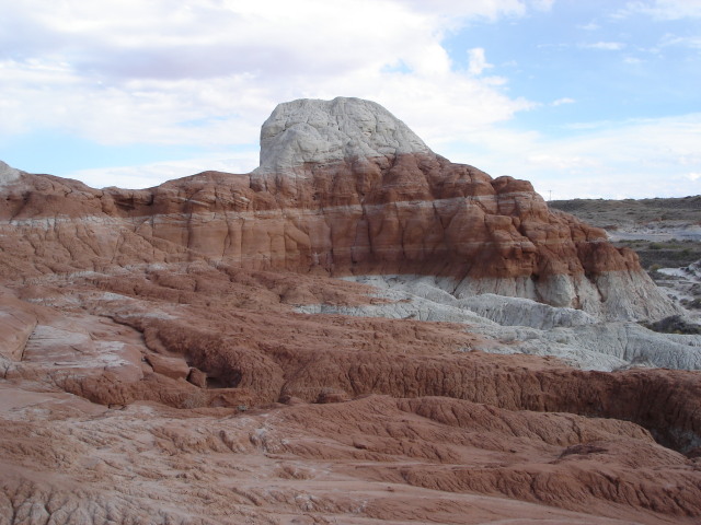 The whole area looks roughly like this, which is fairly spectacular of course. We have it on excellent authority (one of the Grand Staircase BLM Rangers) that this is Carmel Formation rock, common around the San Rafael Swell. In this area, the color striping is amazing. As you'll see. This photo and the last are a fair indication of the terrain on the way in. This sort of thing is actually visible from the road. |