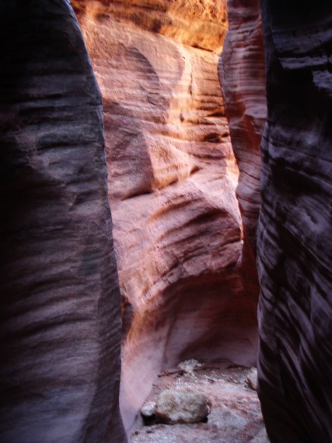 As the pass narrows, the light gets dimmer and more diffuse. The reflections cause color scatter that leads to the crazy rich pallete you see. It varies from slot to slot and spot to spot, but in general as the light fades you'll see more blue.