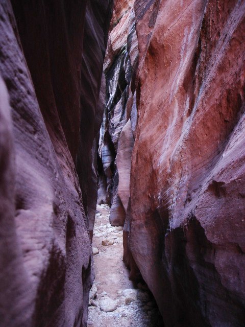 Though this is only a bit narrower than the stretch in the last picture, it's much darker. That's simply because the slot is a lot higher here, and bends a bit further up. Lots more blues and purples. It can be pleasantly cool here, and very still. Not for claustrophobes. |