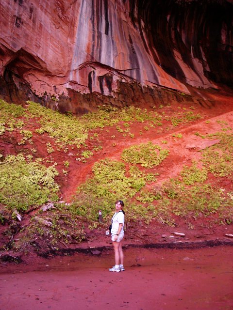 It's big, anyway. And the colors are spectacular. The kind of wall striping you see is fairly common in the Zion area, but not all that typical elsewhere. Must be quite a mineral mix seeping through. The kids have found some other part of the canyon now and are off torturing other hikers. Much better. |
