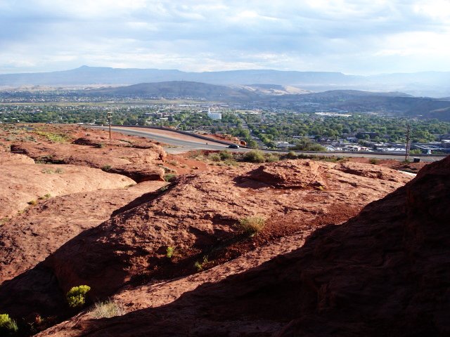 Shot from one of the high points in the park. That's a good chunk of the town with the end of the airport visible to the right -- it's on a table mesa. Whilst dining in one of the more exclusive St. George establishments (Applebee's) we overheard some of the residents discussing the general inferiority of the people of Hurricane, a nearby town. Since sneering seems to be kind of a tradition, we thought about indulging a little ourselves, but decided against it on principle. Besides, Hurricane has Sand Mountain and a happy community of T-Hawk flyers. So there. |