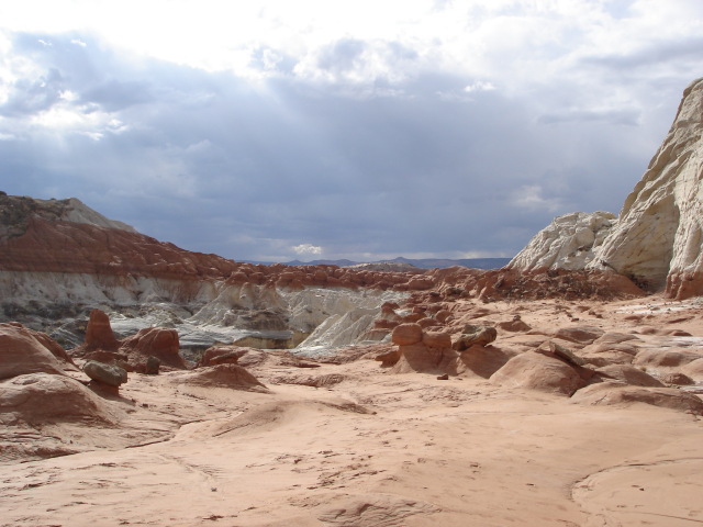 Once you're up, you'll know it. Most of the area is flat, with easy footing. You'll see scenes like this. At the horizon line, you can see how most of the red member has been eroded on this shelf -- it's clearly exposed on both sides. In fact, this shelf may be geologically quite short lived ... just a carpet spread over the next layer down. This is just one of a series of similar box canyons running along this lower step of the Grand Staircase. |