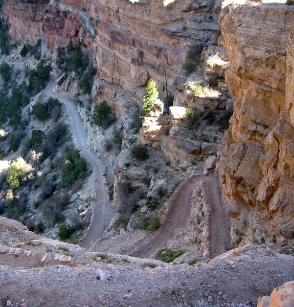 Just a little feel for what the trail is like. About most things the brochures either lied or missed the point. They say it's steep -- and it sort of is -- but nothing outrageous. They say there's no shade, and that's flat out wrong. They fail to mention the obnoxious mule shit everywhere, much of it so ripe your eyes water. They also fail to mention how many people use it. A lot. And this is the 'road less travelled.' I don't even want to think about the traffic on the Bright Angel Trail. Not all of the trail is like this. Some is more level, some nearly straight, and some actually steeper. It's broken up nicely with different riffs so you don't get bored. Gotta note how different the colors are close up. Nothing dull here! |