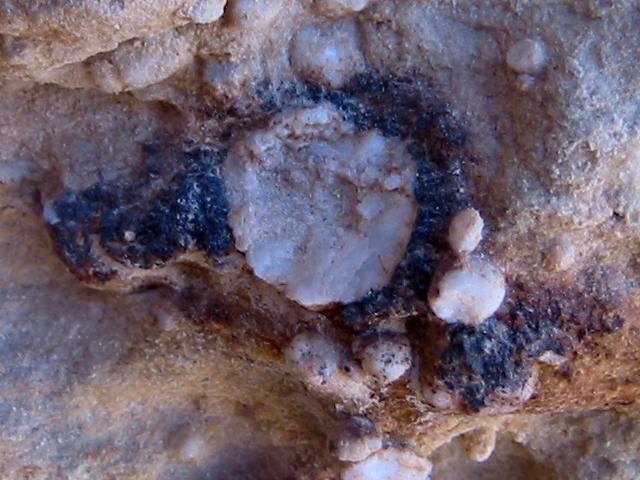 But there was just a brief pause in our flight to snap this shot off, because it may well be the best fossil I saw. On the other hand, it may be some kind of crystal. It's awfully subtle in the picture, but the left side is regularly scalloped just like a seashell -- perfectly appropriate for embedding in limestone, so maybe. |