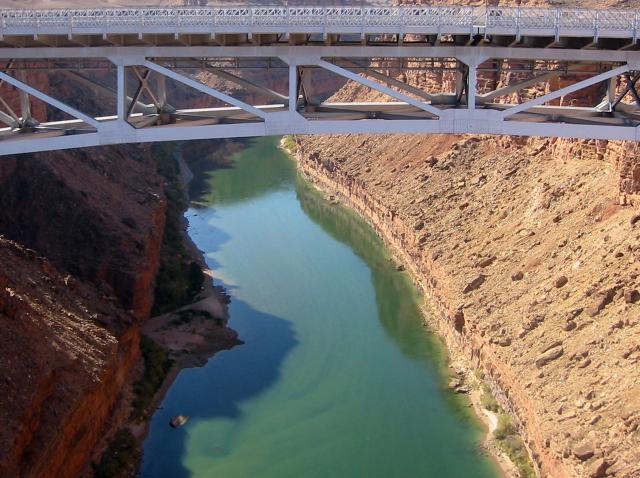 Nothing is right in this picture. That's Marble Canyon, and there is nothing even remotely resembling marble (though it is cutting through limestone). That's the colorado (red) river and it sure looks green to me. At the top, Navajo Bridge, which hardly looks like a Navajo. But there was one nearby -- to the right of this picture is the interpretive center where I learned my entire Navajo vocabulary. Someday I'd like to learn the language so I could see Cheyenne Autumn "in the original." |