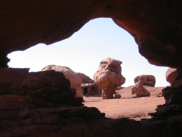 Fortunately we came at this from the east, before getting to the Cliff Dwellers Restaurant of local fame and renown. We still have no official explanation, but I assume this to be the place from whence comes the name of the town (which is just out of view around a turn in the road). To the left of the Goofy Face rock is a house built against a large rock. I'm shooting through the window of a much smaller place (basically a room with a bench) built under a rock not terribly unlike the one in the center. I kind of like Pac Man rock next to it. These boulders rolled from a cliff out of the picture to the left. There's a creek behind me. It's a great place to set up camp. Apparently, someone else thought so. But there's not a word of explanation or 'interpretation' anywhere, which makes this even niftier. |