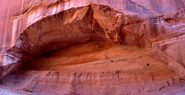 After the first arch series you emerge to an open area with this on one side. It's much bigger than it looks in this photo. If Akk were standing near it, she'd perhaps be 1/8 as tall as the photo. Or less. I had to shoot it as a composite because the distance to the wall across from it is so tight. The colors are simply amazing when you're there, in particular the spot of art near the top of the interior. Though this is forming the same way arches do, there's no guarantee it ever will be an arch. |