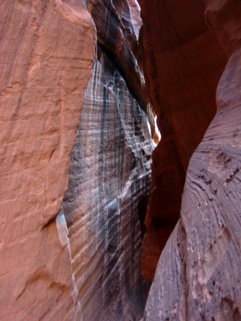 Things got a little tight to the right. The striations were much straighter, though, and in places the varnish got downright wild. This is a Lot Of Fun. Without much preparation to go on, we're starting to understand about here that this set of canyons is going to be way too big to see in the time we have. It was almost like a frantic party, trying to squeeze in as much as possible in the time alotted. |