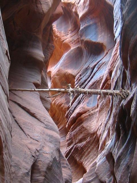 This was as far as we got. The walls were too high to get into a single shot at this point. I'm aiming up and you cannot see either the floor or the top. That is not a branch, it's a full-size tree washed there in a flash. This spot is huge, colorful, shapely, conplicated, and even tight in most places at the bottom. It's incomparable. It's relatively unknown. I hope you don't read this, see it, or feel you have to go. Hard hike, tough drive, brutal experience. Bad. Don't go. Enjoy the pictures. |