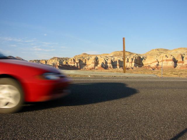 After driving out of the Wire Pass area to the highway, we doubled back a mile or so to get a look at the area of The Cockscomb, an area we'd like to inspect further (some other trip). I shot a few disconsolate photos while Ak was shooting something, then thought it would be fun to shoot the trucks and cars going by against the backdrop. Mostly I missed (or even worse jerked the camera trying to 'track' them). But on one I got lucky, so what the heck. |