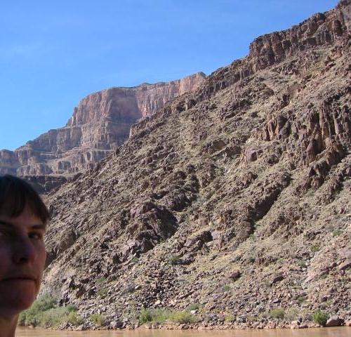 The Vishnu Schist, of course. The monstrously compressed and metamorphosed precambrian rock from which the steep inner gorge is cut. I've heard of this since I was a kid, poring over geology articles and texts (I was a tiresome rock collector, which my parents made fun of. Later in life, they became far more devoted than I had ever been...) This is directly across the river from the granite Ak is scrambling on the previous page. There is also some right across the creek. |
