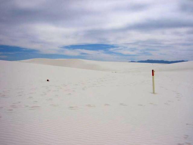 A little lesson in sand movement. The dot on the left is a path marker identical to the one on the right. Who knows how many of them are just buried out there? The 'path' is obviously a fluid thing -- if you go, you won't see the same place we did. I never imagined it would be as spectacular as it was. And looking at these pictures, they don't begin to show it. Well, they begin... |