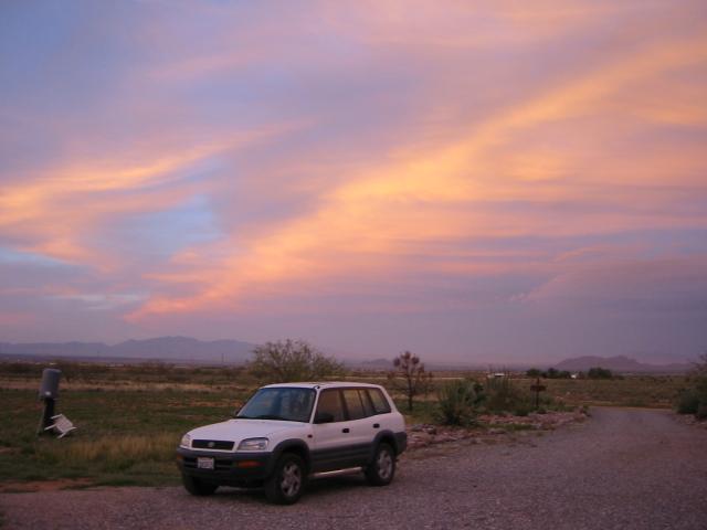 This is sunset at the Erbeck house. The main point of the trip was to see Ed and Carol again, some expatriate bayareans living southeast of Tucson. This kind of view is common enough that Ed could tell us it would happen and when to get the cameras out. This is not the most spectacular shot, but maybe the most interesting. |