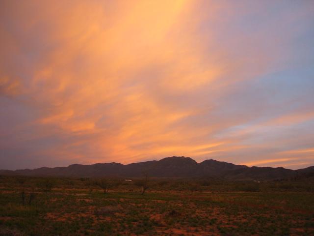 The same sunset looking out the back yard. They own most of the foreground. The mountains in the background are the site of Cochise's Stronghold where the great Apache Chief held off the US Cavalry more or less indefinitely. Now it's a park. If you go there, you'll see why he was able to hold out -- the weather's nice, there's water, and lots of narrow places for ambushes. We had a nice visit and it's not at all hard to see why they moved there. Both of these photos are completely unretouched, by the way. All I did was scale them down to fit your screen. |
